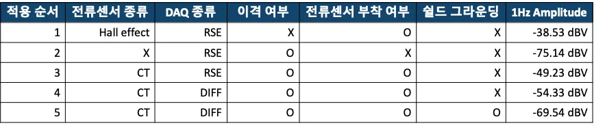 표 1에서는 지금까지 수행한 노이즈 저감 대책을 순서대로 나열하였고, 각 시행에 따른 측정 환경과 1Hz에서의 Amplitude를 비교해 각 대책의 실효성을 수치적으로 확인할 수 있습니다.