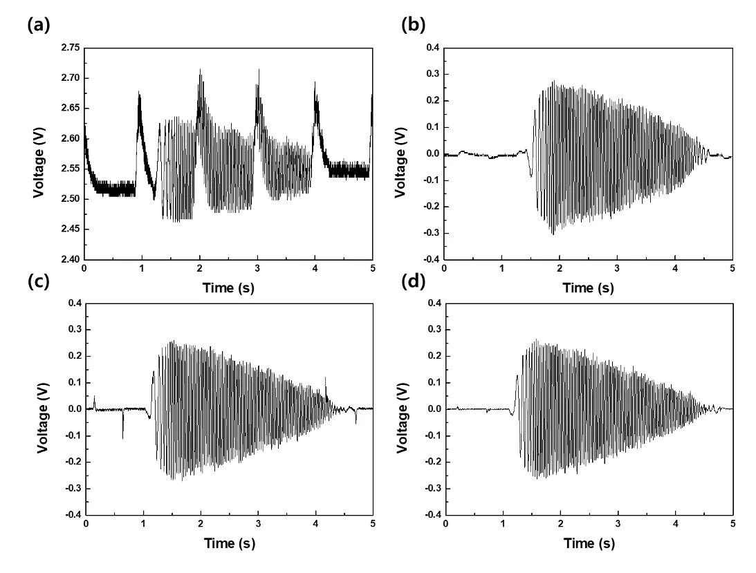 그림 14. 모터를 동작시켰을 때 신호 비교 (a)문제 상황, (b)노이즈원과의 이격 및 CT 사용, (c)Differential input 사용, (d) shielding 사용