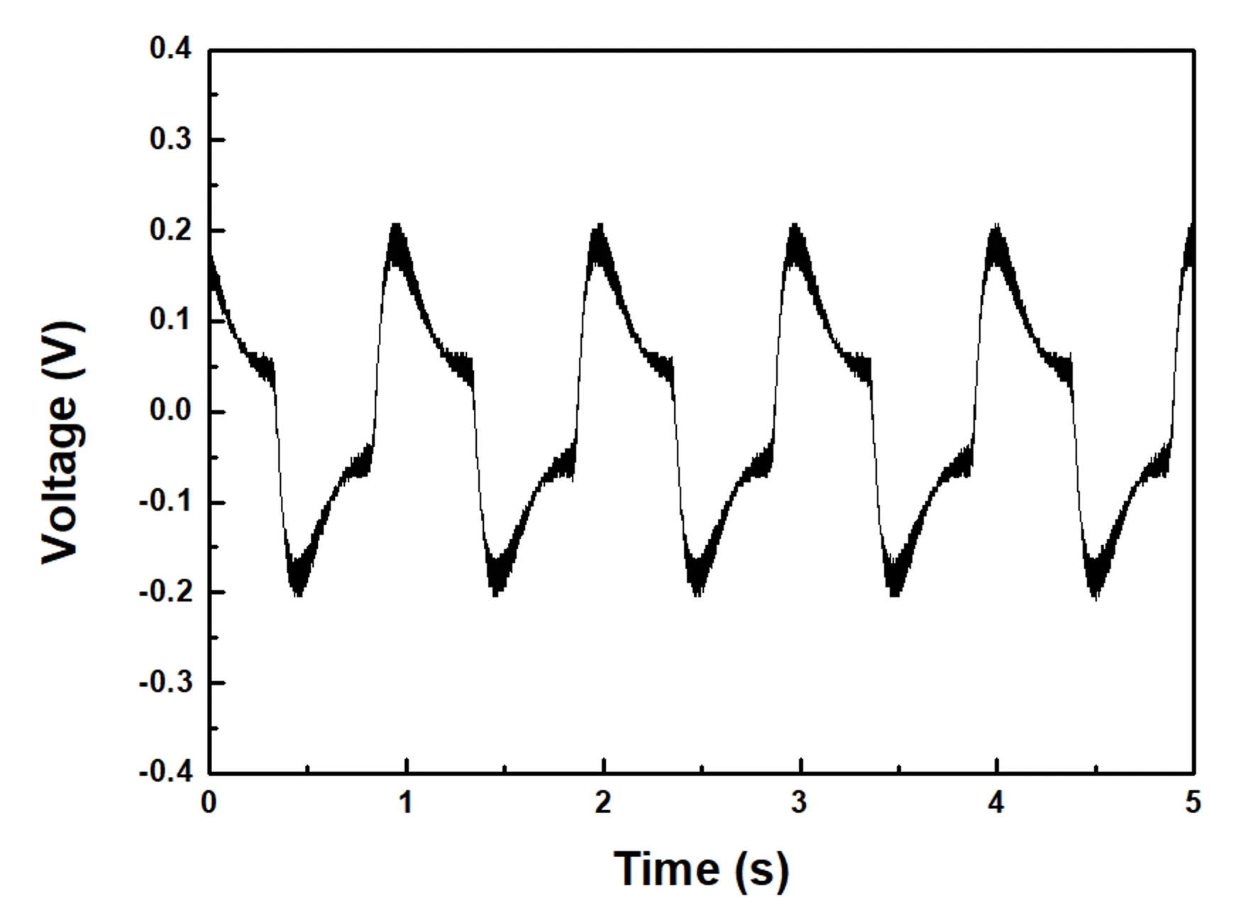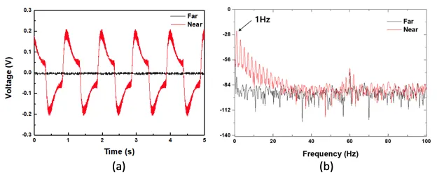 반면에 가까이 있는 경우에는 시간 영역에서 peak to peak가 0.2 V 정도로 크고 주파수 영역에서 주요 peak는 동일하게 1Hz 로, 노이즈가 이전과 같이 발생함을 파악했습니다.
