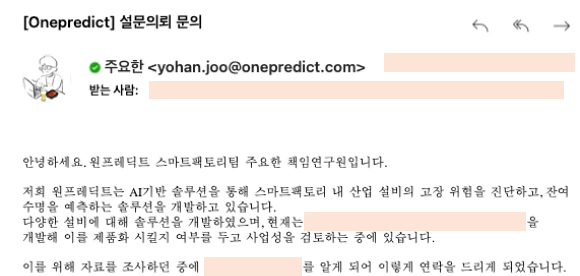 원프레딕트 내에는 오랜기간 제조업 분야에서 B2B 영업을 수행해온 전문 기술영업팀이 존재합니다. 덕분에 코로나 시국임에도 기업들과 컨택해 구매의향에 대한 조사가 이뤄졌습니다. 또한 PoC를 통해 실제 제품으로 해당 내용을 조사하는 것도 방법이었습니다.