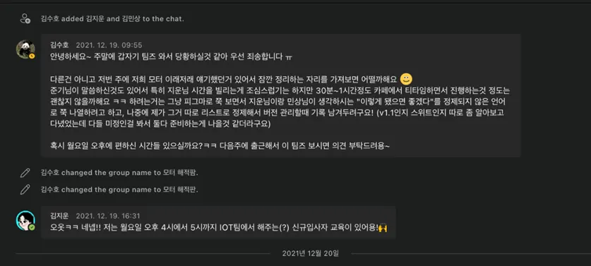 민상 - 제품 및 소프트웨어 관련 중요한 커뮤니케이션은 저희 3명이 주도권을 가지고 진행을 했고요. 팀 외적인 커뮤니케이션은 거의 수호님이 담당해주셨어요.