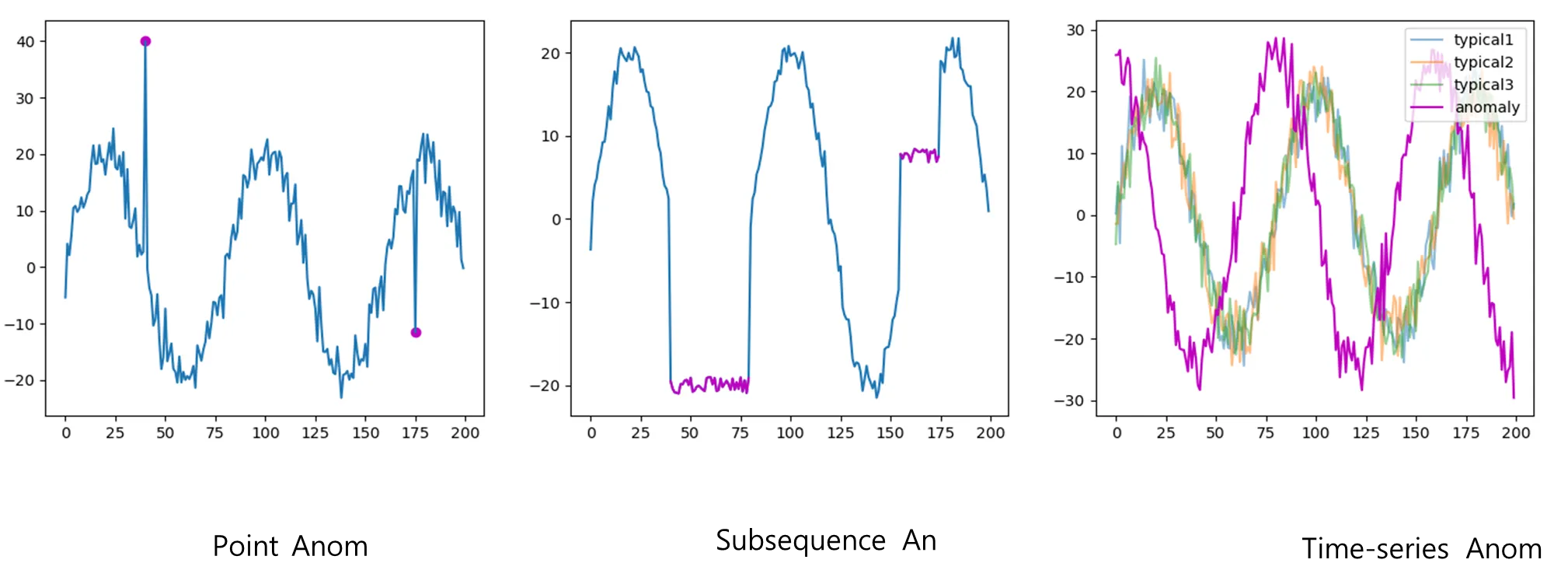 진동과 다르게 비진동 데이터의 고장 경계 값은 정규화 되어있지 않고 수많은 인자가 서로 영향을 끼치기 때문에 고장 모드 검출을 위해 비진동 데이터를 활용하는 방법은 기술의 고도화가 필요합니다. 저희는 비진동 데이터를 활용하기 어렵다는 문제를 해결하기 위해 데이터의 이상 감지(anomaly detection) 방법론에 집중하였습니다. 아래 제시된 그림4처럼 갑작스럽게 튀는 값이 발생하거나(point anomaly), 연속적인 값들이 정상일 때와 다른 패턴을 보이거나(subsequence anomaly), 다른 시계열 데이터와 비슷한 패턴을 보여야 할 시계열 데이터가 다른 패턴을 보일 때(time-series anomaly)와 같이 다양한 종류의 이상이 발생할 수 있습니다. 원프레딕트의 GuardiOne