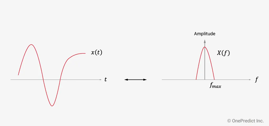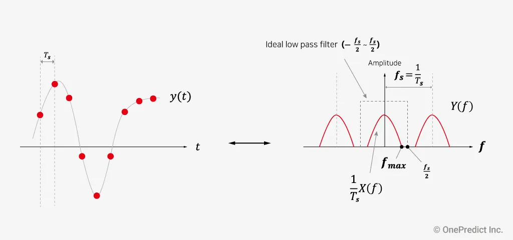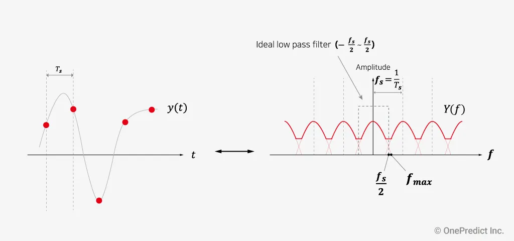 예를 들어, 샘플링 속도()가 12,800Hz이라면 나이퀴스트 주파수()는 6,400Hz이고 최대로 측정 가능한 데이터의 범위가 6,400Hz이므로 수집한 데이터의 최대 주파수는 6,400Hz를 초과하지 않는 것이 좋습니다. 따라서 나이퀴스트 주파수를 고려하여 관심 주파수 범위를 벗어나지 않게 샘플링 속도를 설정해야 할 필요가 있습니다.