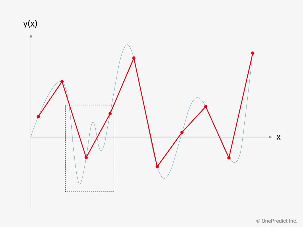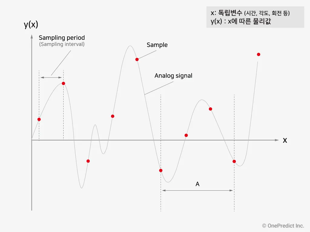 샘플링 주기는 ‘두 개의 연속 샘플들 사이의 지속시간’을 의미합니다. 그림 1을 참고하면, 독립변수(x)가 시간일때 두 연속적인 빨간점 사이의 간격을 샘플링 주기라고 할 수 있습니다. 예를 들어, 진동 신호의 샘플링 주기가 0.1초이면 샘플들 사이의 시간 간격이 0.1초란 뜻입니다.