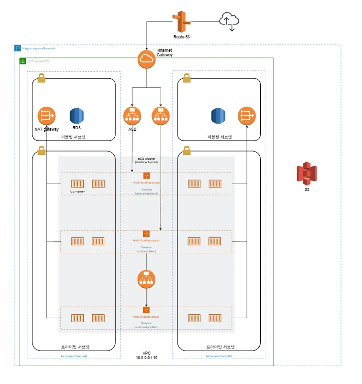 가디원 모터의 서비스 구조는 위와 같으며, 해당 구조는 실제로 AWS 서비스들을 이용해 구성되었습니다. 코드로 구현한 각 API들을 Container화 시킨 후, AWS의 서비스들을 이용해 네트워크 설정, 배포, 로드밸런싱, 오토스케일링, DNS 설정 등을 구현해 실제 고객들에게 제공합니다.