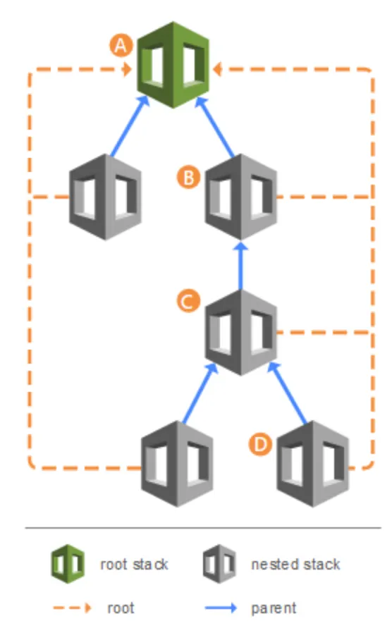 이럴 때 필요한 게 Root Template 입니다. CloudFormation에서는 Nested Stack 이라는 기능을 이용해 여러 개의 템플릿을 하나의 템플릿으로 관리하고 실행할 수 있습니다.