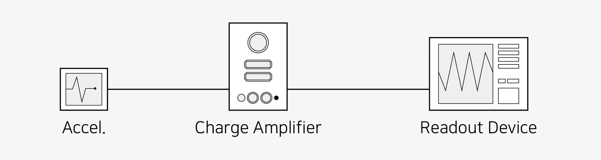 먼저 전하타입 즉, 차지타입은 신호를 증폭시켜줄 증폭기(Amplifier)가 시스템 외부에 구성되기 때문에 고온에 견딜 수 있는 이점이 있습니다. 하지만 그림 2 와 같이 증폭기를 따로 구성해야 한다는 점에서 높은 구성비용과 설치과정의 번거로움이 단점으로 작용합니다. 전압타입은 증폭회로가 센서에 내장된 구조이며 제조사에 따라 ICP(Integrated Circuit Piezoelectric)타입 혹은 IEPE(Integrated Electric Piezoelectric)로도 불려집니다.