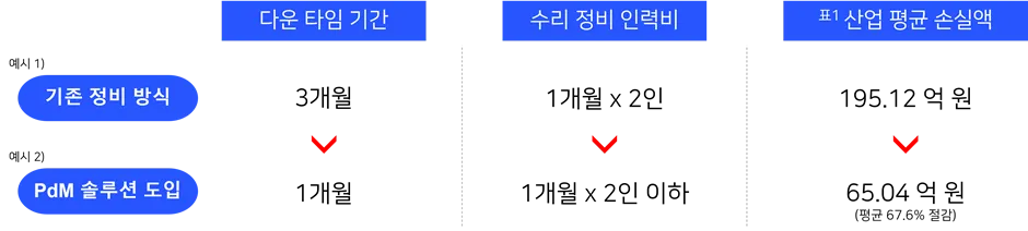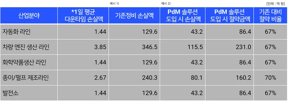 아래 표에서는 5가지 산업의 일평균 다운타임 발생 시 예상 피해 금액과 기존 점검방식 대비 PdM솔루션 도입 시 절약금액 및 그 절약 비율을 산정하고 있다. [1]