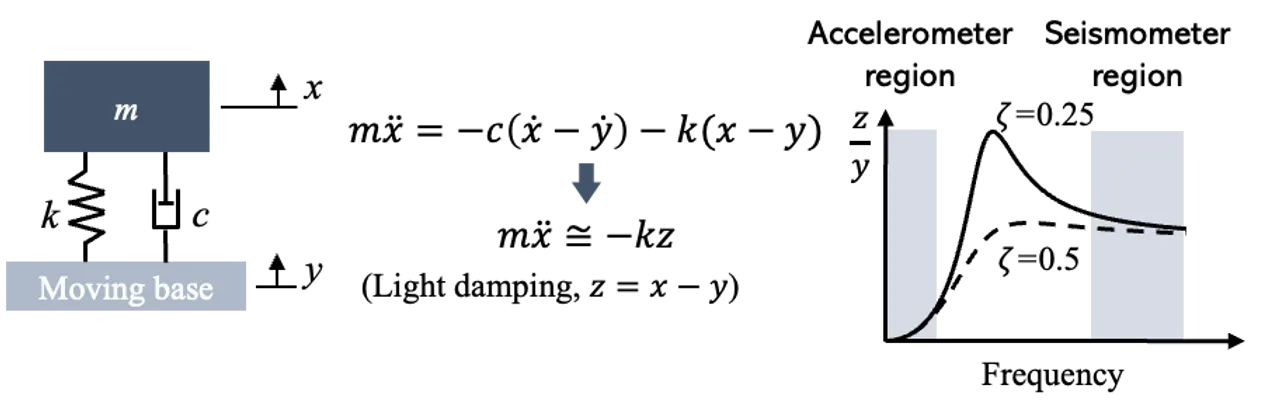 진동 센서의 원리는 움직이는 물체에 대한 상대적인 변위를 측정하는 것인데요, 부착된 설비를 Moving Base라고 할 때, 진동센서가 일종의 mck 시스템 (질량 - 댐퍼 - 스프링 시스템)을 구성하게 되어 Moving Base에 대한 상대적인 변위를 측정하게 됩니다. 이렇게 발생한 상대 변위는 시스템에서 발생하는 진동 정보를 표현할 수 있습니다.
