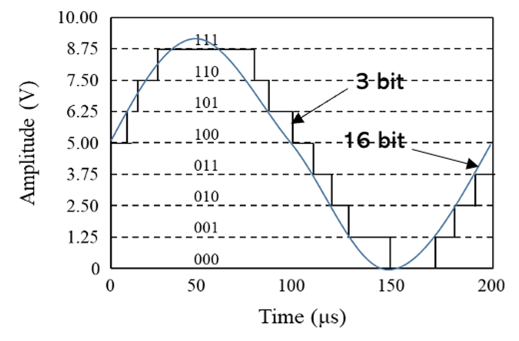 센서의 비트 수는 센서의 해상도를 직접적으로 의미합니다. 센서의 비트 수가 많을수록 해상도가 높아지는데요, 예를 들어, n비트 분해능을 가진 센서는 측정가능한 아날로그 물리량의 범위를 개의 이산된 값으로 구분하여 나타낼 수 있습니다.