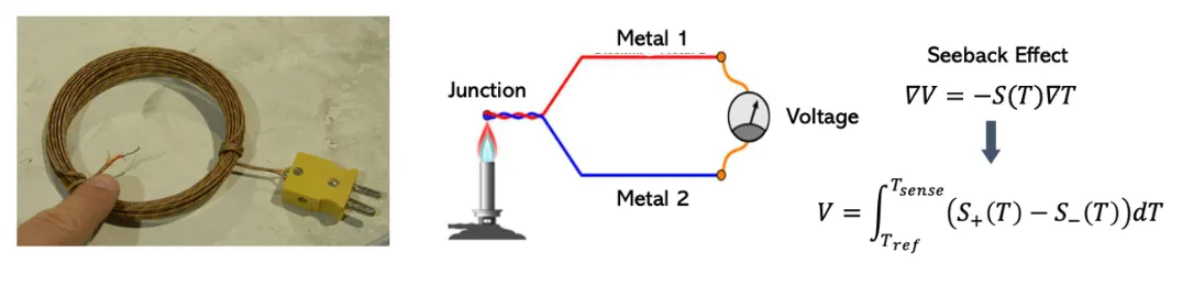 열전대는 온도를 측정하기 위한 온도 센서입니다. 열전대는 서로 다른 두 가지의 금속으로 구성되는데요, 두 금속을 하나의 Junction (접합부)에 연결하고 온도를 가하면 각 금속의 온도 gradient (구배)에 따라 전압 차가 발생한다는 Seeback 효과를 사용하여 온도를 측정합니다.