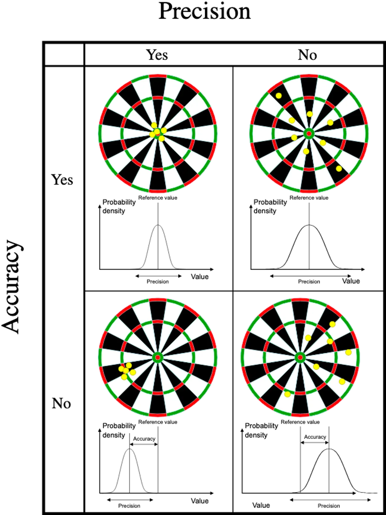 정확도는 측정된 값이 실제 값 또는 예상값에 얼마나 가까운지를 나타내는데요, 동일한 물리량을 여러 번 측정했을 때 정밀도로 인해 각각 서로 다른 오차가 포함된 값이 나타나겠지만, 해당 값의 평균이 실제 값과 유사한지를 측정하는 등으로 정확도를 표현할 수 있습니다.