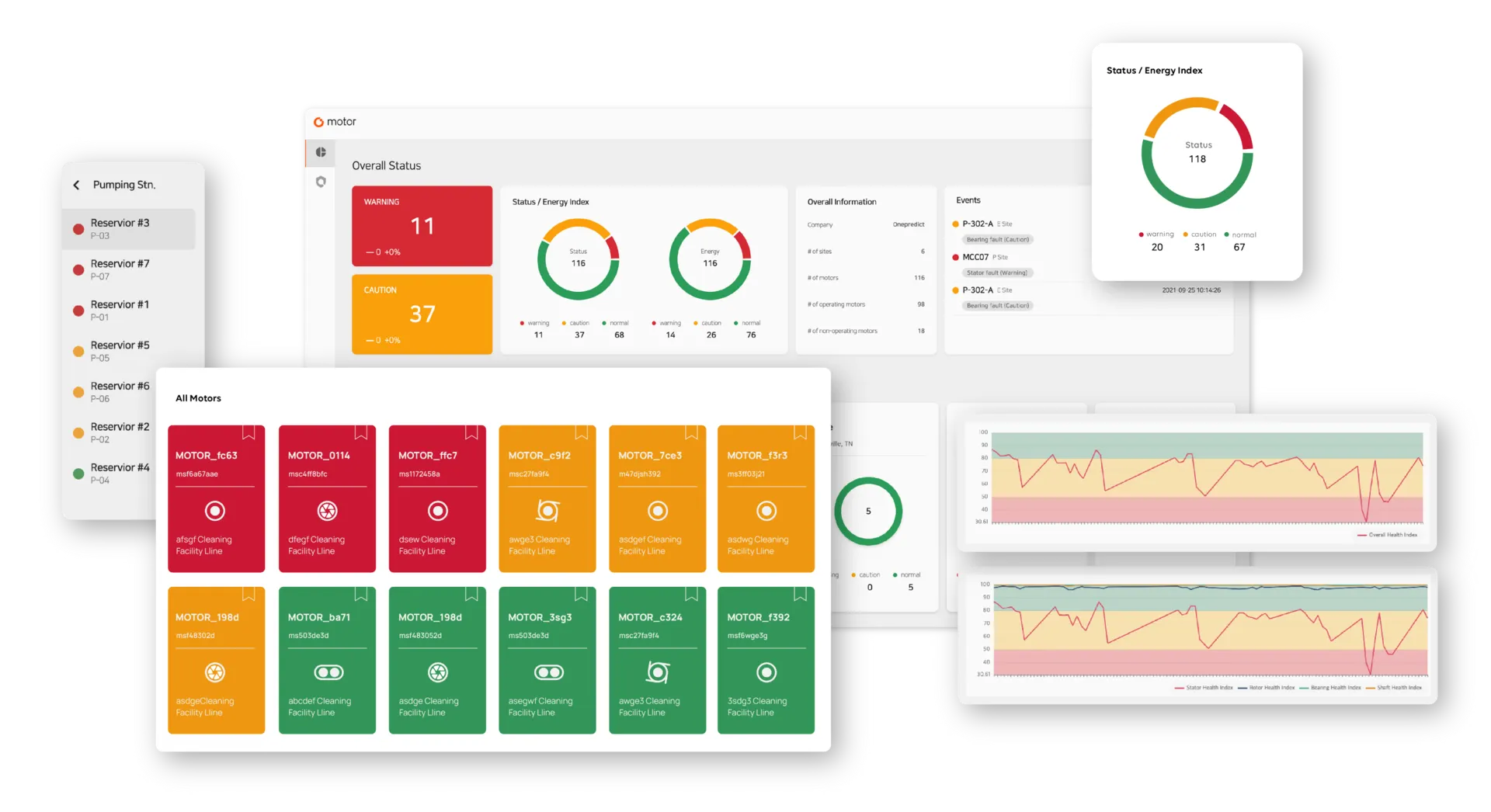 하지만, ‘가디원 모터’ 솔루션을 도입하게 되면 현장에 방문하지 않고 온라인 환경에서 1,000대 이상의 모터 상태를 시스템 대시보드에서 모니터링 할 수 있으며, 이상 발생 위험도가 높은 ‘관찰과 주의’ 설비 우선 확인하여 유지보수 시간을 줄일 수 있습니다.