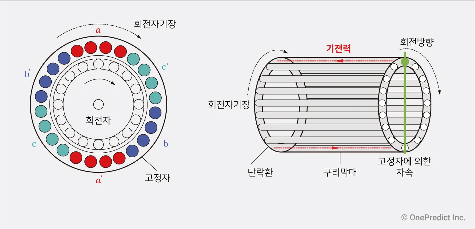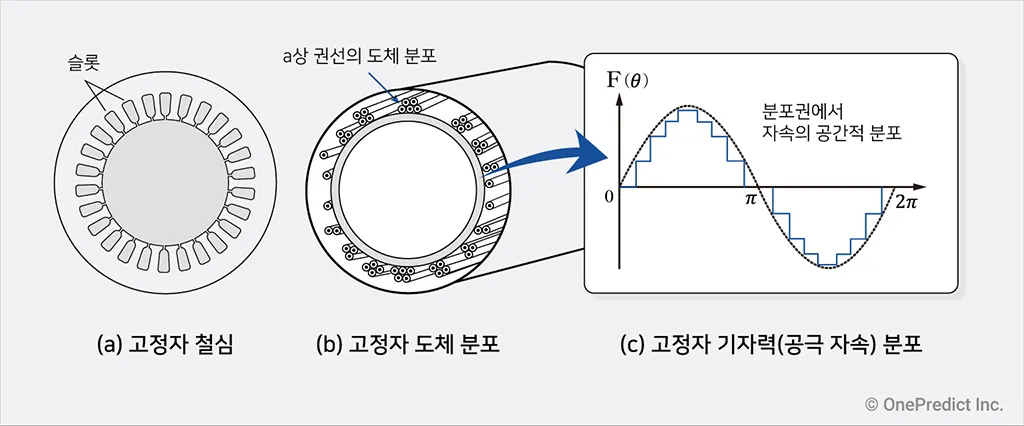 유도 전동기의 구조는 <그림 1>에서 확인할 수 있듯이, 크게 고정자(Stator)와 회전자(Rotor)로 이루어져 있다. 고정자는 회전 자계를 만들기위해 입력된 3상 전류가 직접적으로 흐르는 권선들이 뭉쳐 있는 곳이며, 이름에서 알 수 있듯이 전동기 케이스에 고정되어 있다. 이때 흐르는 전류에 의한 공극 자속이 정현적인(Sinusoidal) 특징을 갖게 하기 위해 <그림 2>와 같이 각 상의 도체들을 정현적으로 배치한다.