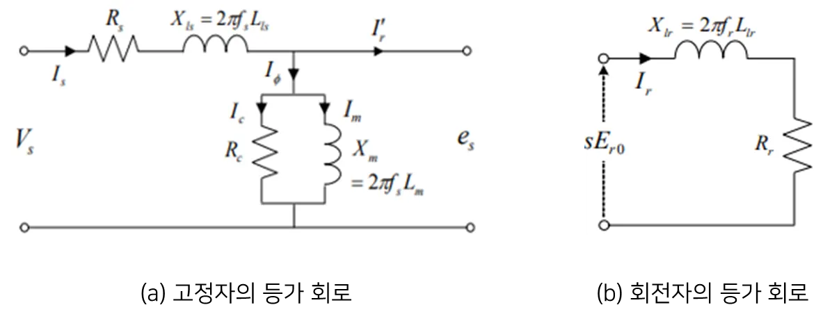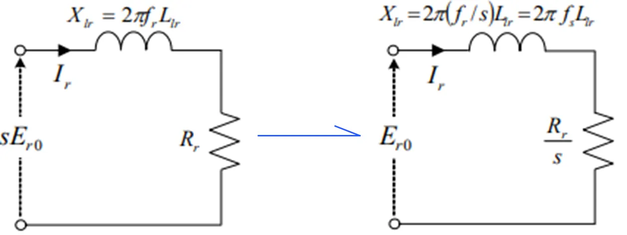 이제 회전자 권선의 등가 회로를 유도해 모터 전체 등가 회로를 유도해 보자. 회전자 도체에는 식 (8)의 유도 기전력에 의한 전류가 흐르게 된다. 이 때, 회전자 권선의 저항을 , 누설 인덕턴스를 이라 하면, 회전자 권선의 등가 회로는 그림 2 (a)와 같이 표현된다. 그러나 모터 회전자의 동작 주파수는 이고, 모터 고정자 회로의 동작 주파수는 이기 때문에, 그림 2 (b)의 고정자 회로의 등가 회로와 이 회로를 결합할 수 없다. 따라서, 그림 2 (b)의 회전자 등가 회로의 전압과 임피던스를 슬립으로 나누어, 그림 3과 같이 고정자 회로의 동작 주파수와 동일하게 만든다.
