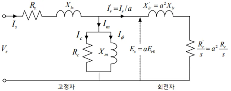결과적으로 그림 3의 회전자 등가 회로는 고정자 측에서 본 회전자의 등가회로이다. 이제 마지막으로 고정자와 회전자 각각의 권선 비를 고려하면, 그림 4와 같이 결합된 전체 등가 회로로 표현할 수 있다. 이 때, 기호 ‘(Prime)은 고정자 측으로 변환된 회전자 측의 물리량을 의미한다.
