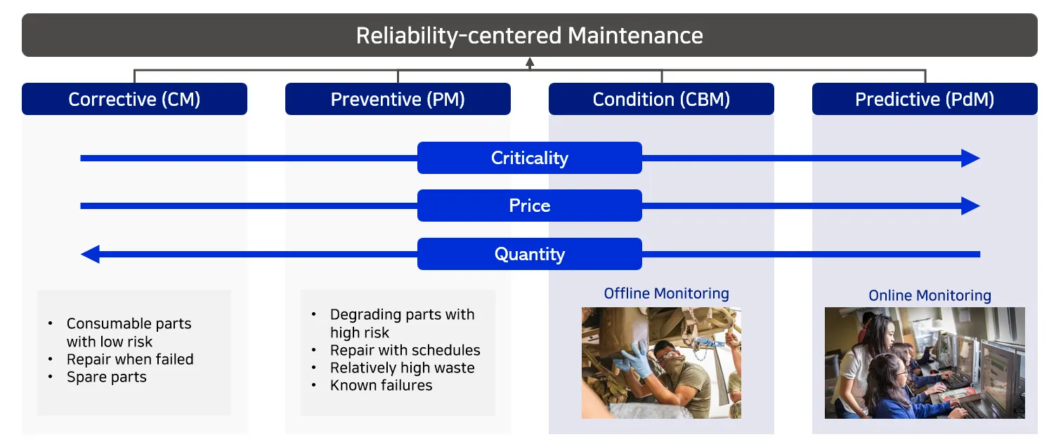 모든 유지보수 방법은 각각의 고유한 장점과 단점이 존재합니다. 만약 고장 발생이 큰 사회적 비용을 야기할 수 있다면, 고장 자체를 방지하는 PdM 방법이 적합합니다. 한편으로 고장 자체보다는 다운타임 비용이 많이 드는 산업이라면 CM이 가장 효율적인 방법일 수 있습니다. 따라서 유지보수 방법을 선택할 때는 설비의 비용, 고장에 따른 위험성과 손실, 설비의 가용성 등 다양한 요소를 고려해서 산업의 요구 사항에 가장 적합한 접근 방식을 선택하는 것이 중요합니다.
