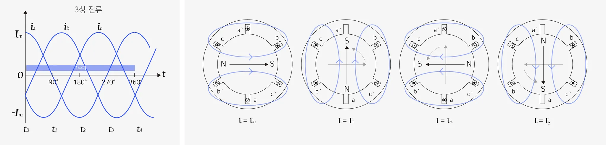 그림 1. 회전 자계의 이동 방향: (a) 3상 교류 전류, (b) 시간에 따른 회전 자계와 합성 기자력의 방향