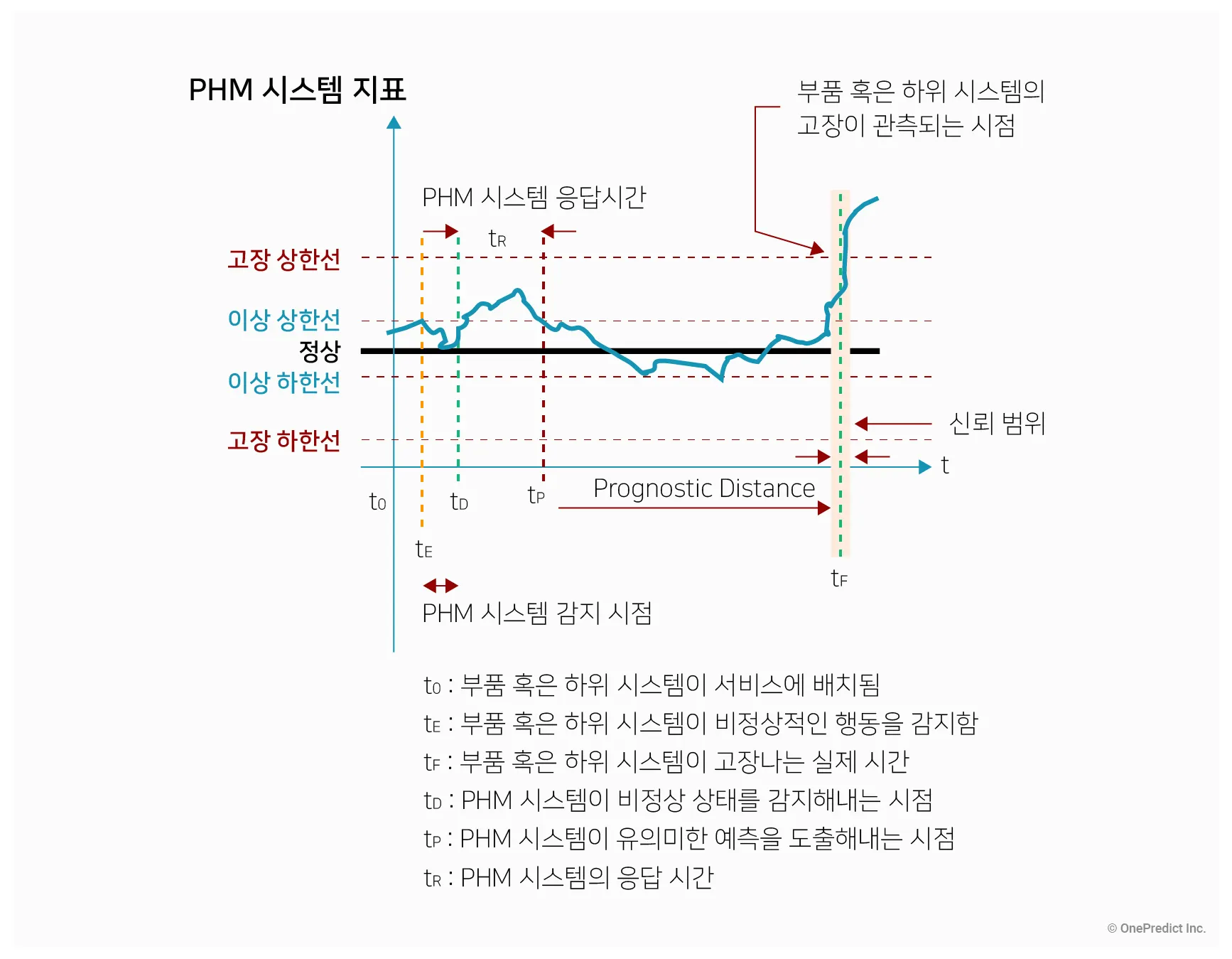 t(D)에서부터 계산이 끝나는 시점인 t(P)에 이르기까지, 즉 응답시간 t(R) 기간 동안 PHM 시스템은 예상되는 고장 시점을 도출해냅니다. 모델이 정확한 결과를 도출해낼 수록 예상한 시점은 실제 고장 발생 시점인 t(F)와 일치하게 됩니다.