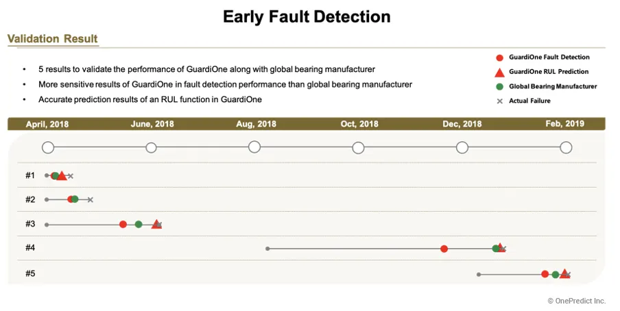 5개의 구름베어링 시편을 대상으로 수개월간 베어링을 동작시키며 두 솔루션이 베어링의 결함을 감지해내고 고장 시점을 예측했습니다. 실험 결과, 원프레딕트는 더 민감함 Fault Detection을 통해 조기에 결함의 발생을 감지해내었고, 정확한 prognostics accuracy를 달성하면서 그만큼 더 긴 prognostics distance를 확보하였습니다. 설비를 운영하는 운영사 입장에서는 이를 통해 정비를 위한 충분한 시간을 확보할 수 있었으며, 설비의 갑작스러운 shut down에 대비할 수 있었습니다. 앞서 소개된 지표들을 통해 PHM 솔루션을 도입하려는 운영사들은 더 나은 솔루션을 판단할 수 있습니다.