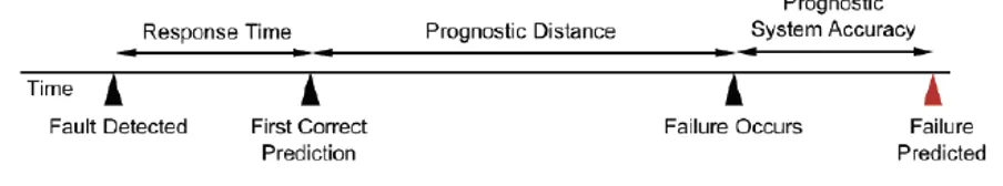 Prognostics를 위해서는 먼저 결함을 감지해내야 합니다(Fault Detection). 결함이 감지된 후 알고리즘에서 이를 분석해 일정 시간(Response Time)이 지나면 예측 결과를 도출해냅니다(First Correct Prediction). 예측 결과를 도출한 시점으로부터 실제 고장이 발생하기까지의 시간을 Prognostics Distance라 하며, 고장 발생을 예측한 시점과 실제 고장이 발생한 시점의 차이를 정량화 시킨 지표를 Prognostics System Accuracy라 합니다. 이들은 Prognostics의 성능 지표로 사용될 수 있습니다.
