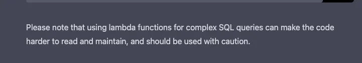 “복잡한 SQL 쿼리에 Lambda 함수를 사용하면 코드를 읽고 유지관리하기 더 어려워질 수 있으므로 주의해서 사용해야 합니다.”