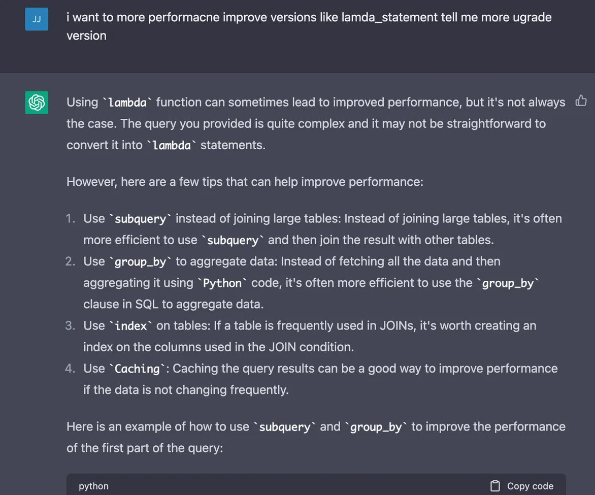 ChatGPT 도 그럴듯한 답변에는 문법적인 오류가 있는 답변만 열거하는 식의 연속이었고, SQL 튜닝 관점에서 성능을 올리는 방법에 대한 답변을 마지막으로, 복잡한 쿼리는 Raw SQL 을 대체할 만한 녀석이 없었다는 것으로 결론을 지었습니다. 그래도 일반적인 OLTP 시스템의 경우는 좋은 성능 향상 도구가 될 거라 생각됩니다.