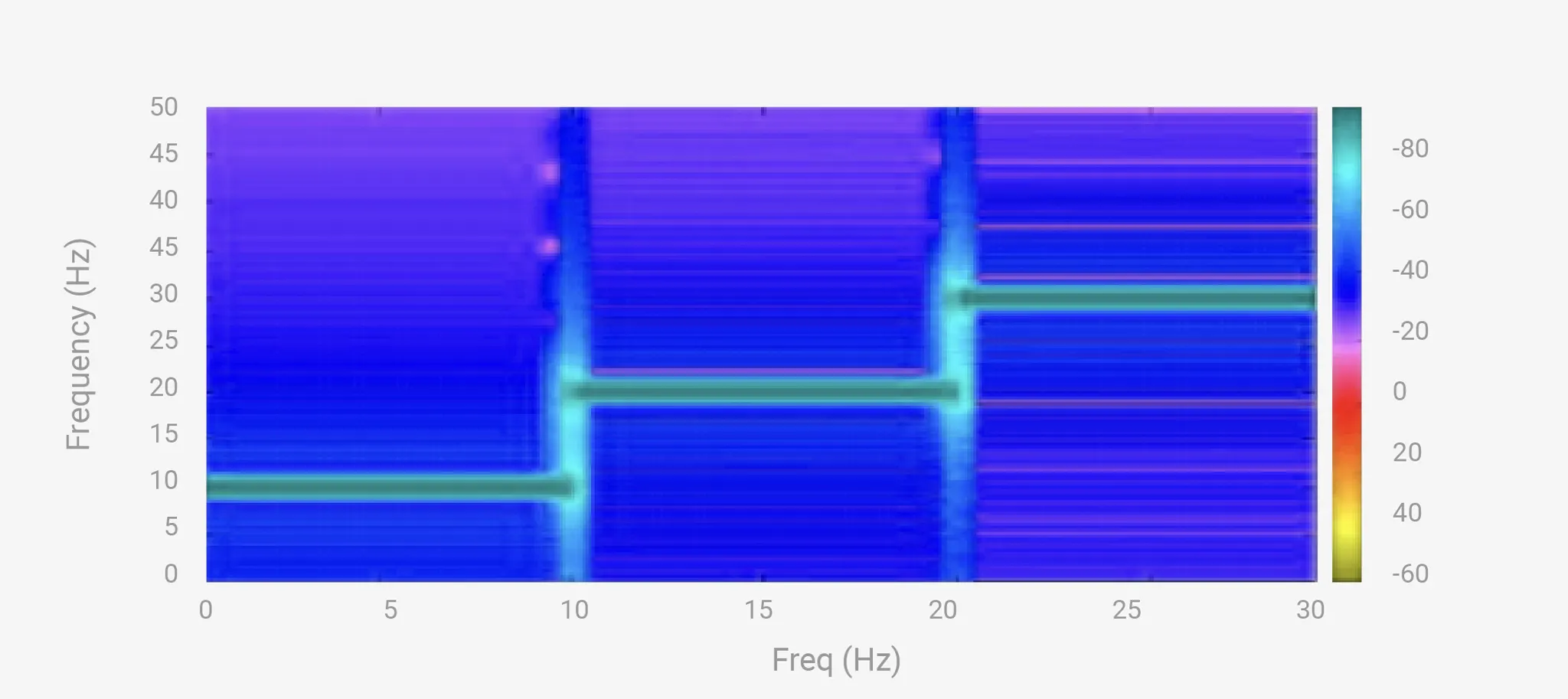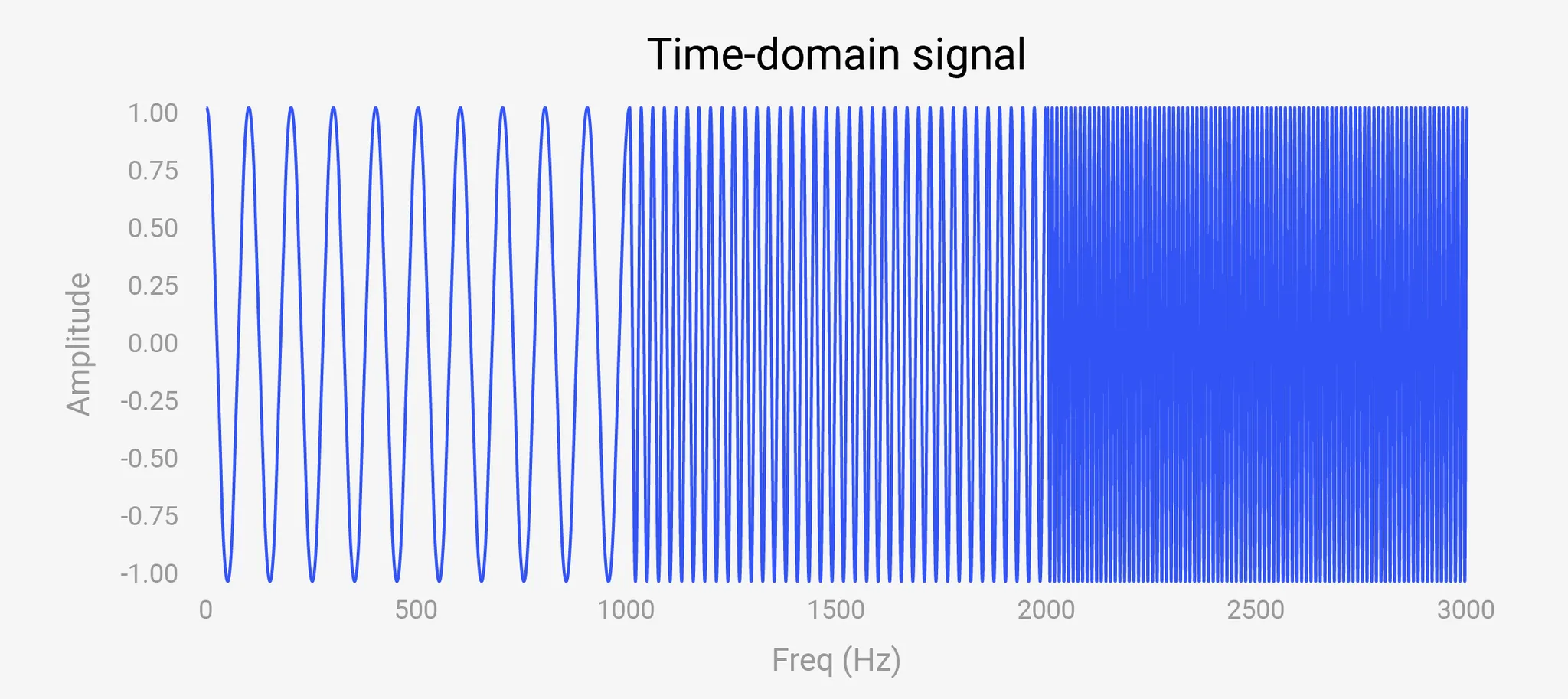 즉, 아래 그림처럼 일정한 주기가 아닌 시간의 흐름에 따라 주파수가 변화하는 신호라면, Fourier Transform으로는 각각의 주파수가 시간적으로 언제 존재하는지까진 알 수 없다는 한계가 있습니다.