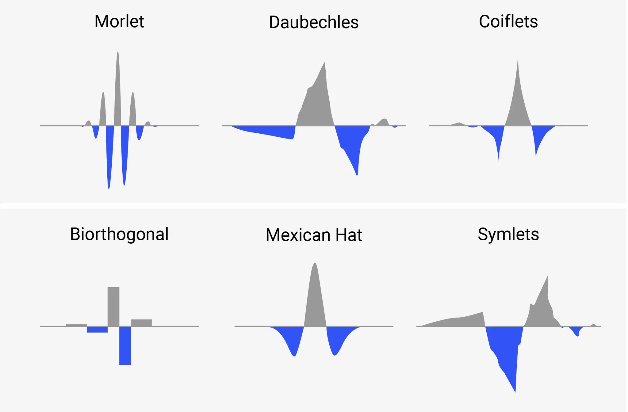 이 변환은 시간 영역에서의 신호를 웨이블릿 함수를 기준으로 합니다. 웨이블릿은 아래와 같이 다양한 종류로 나타나기 때문에, 필요에 따라 유연하게 하나를 선택해서 사용할 수 있죠. 웨이블릿 종류를 시간에 맞춰 Scaling(신호의 크기를 확장 또는 축소)하거나 Shifting(신호를 시간축 상의 특정 위치로 평행 이동)하여 복잡한 신호도 분석할 수 있습니다.