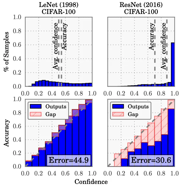 모델의 uncertainty를 정량화 하는 것 이외에도, 대다수의 Bayesian deep learning 방법들은 기존 딥러닝 모델에 적용했을 때 overconfidence 문제를 완화해준다고 알려져 있습니다. 모델의 예측값이 정확한 것도 중요하지만, 동시에 예측값이 실제 확률을 반영하는 것 역시 중요하며 이를 calibration이라고 합니다. 현대의 뉴럴넷은 정확도는 향상되었지만 지나치게 overconfident한 예측값을 보여주면서 calibration 성능이 매우 나빠지는 경향이 있습니다.