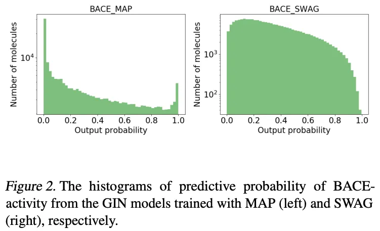 Overconfidence 문제를 해결하는 방법으로 temperature scaling 등 예측값의 logit 자체를 튜닝하는 여러 방식들이 제안되어 왔지만, Bayesian deep learning 방식을 적용하는 것이 이를 온전하게 해결한다는 연구들이 여럿 있어 왔습니다. 아래 그림에서도 볼 수 있듯이, 기존 방식(BACE_MAP)에서의 예측 logit값이 0 혹은 1에 지나치게 몰려 calibration 성능이 나쁜 경우에 Stochastic Weight Averaging-Gaussian 이라는 Bayesian deep learning 방법을 적용함으로써 예측 logit값들이 고른 분포를 보이면서 overconfidence문제가 해결됨을 알 수 있습니다.