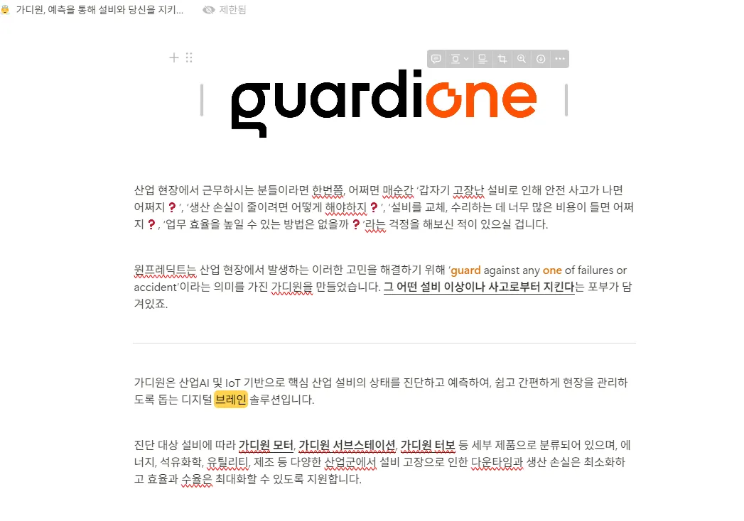 원프레딕트는 산업 현장에서 발생하는 이러한 고민을 해결하기 위해 ‘guard against any one of failures or accident’이라는 의미를 가진 가디원을 만들었습니다. 그 어떤 설비 이상이나 사고로부터 지킨다는 포부가 담겨있죠.